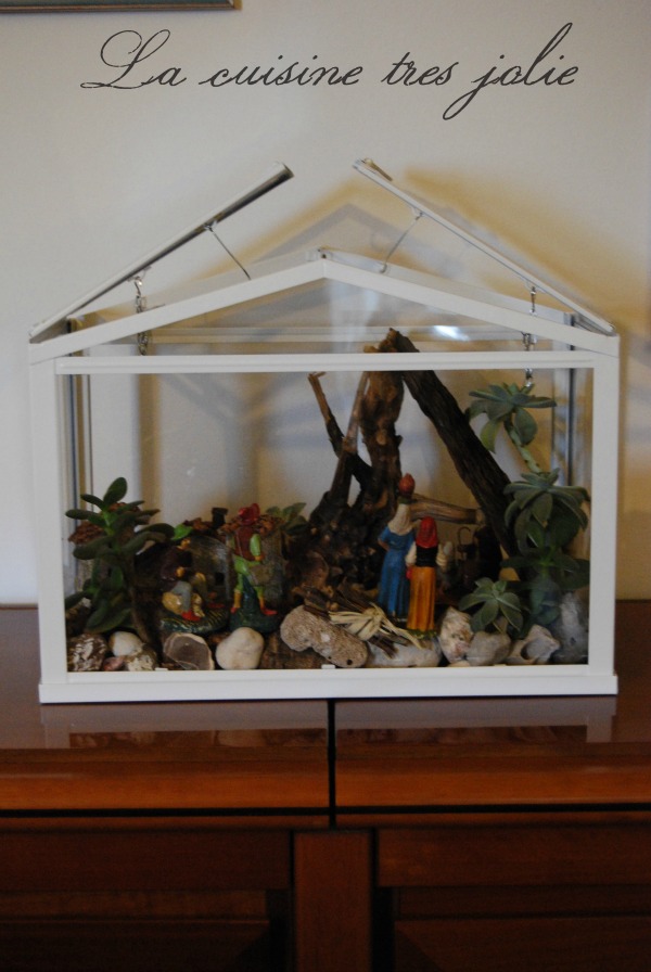 Vi faccio vedere quello principale che secondo me è davvero bellissimo, anche se le foto non gli rendono giustizia al meglio. E’ stato fatto in una piccola serra soprammobile ed è pieno di piante grasse e di rametti reperiti in montagna.